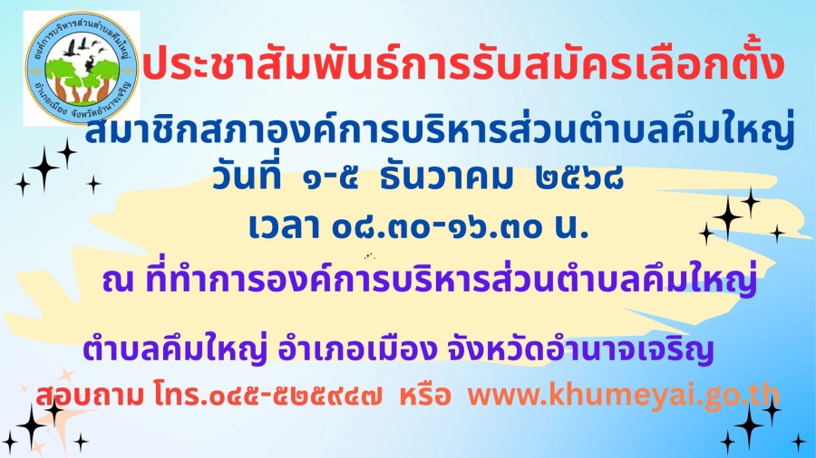 ประชาสัมพันธ์ การรับสมัครเลือกตั้งสมาชิกสภาองค์การบริหารส่วนตำบลคึมใหญ่ วันที่ 1-5 ธันวาคม 2568 วันอังคาร, 25 พฤศจิกายน 2568 14:22 พิมพ์ อีเมล แสดงความคิดเห็น ***กรุณาแสดงความคิดเห็น ด้วยความสุภาพ เคารพต่อสิทธิของผู้อื่น ไม่ละเมิดต่อกฎหมาย และศีลธรรมอันดีของสังคม ข้อความ * ใส่ความคิดเห็นของคุณ... ชื่อ * อีเมล * URL เว็บไซต์ของคุณ (ถ้ามี) back to top