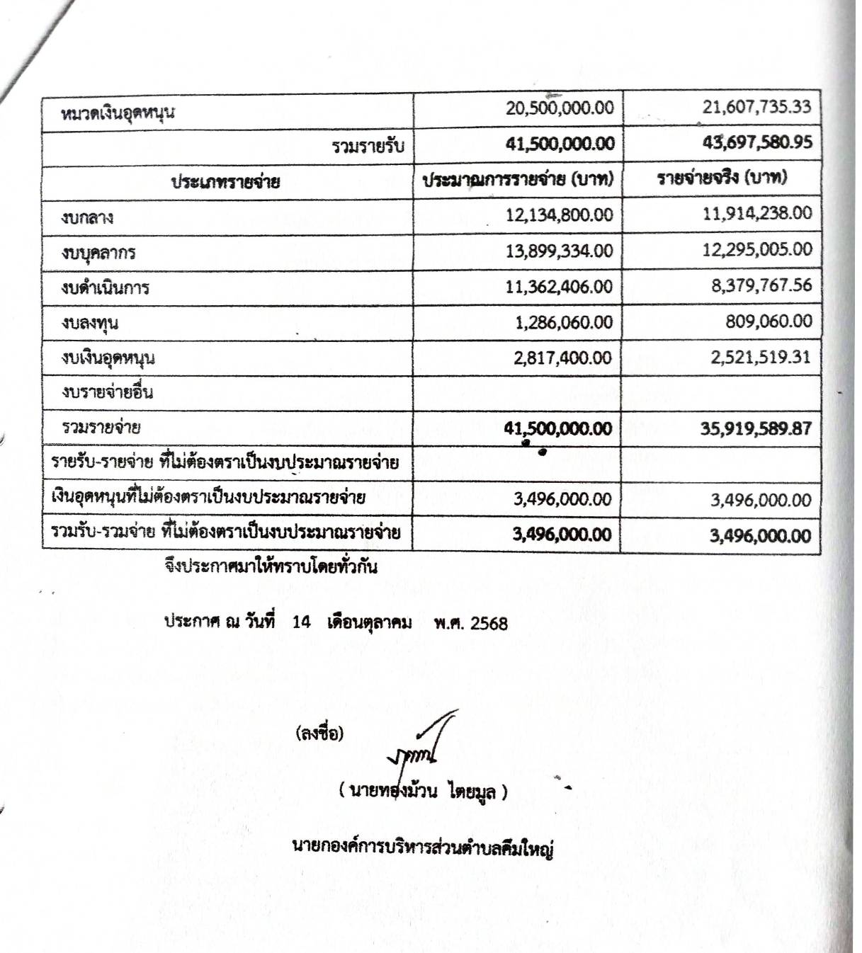 ประกาศองค์การบริหารส่วนตำบลคึมใหญ่ เรื่อง รายงานการรับเงิน-จ่ายเงิน ปีงบประมาณ ๒๕๖๘